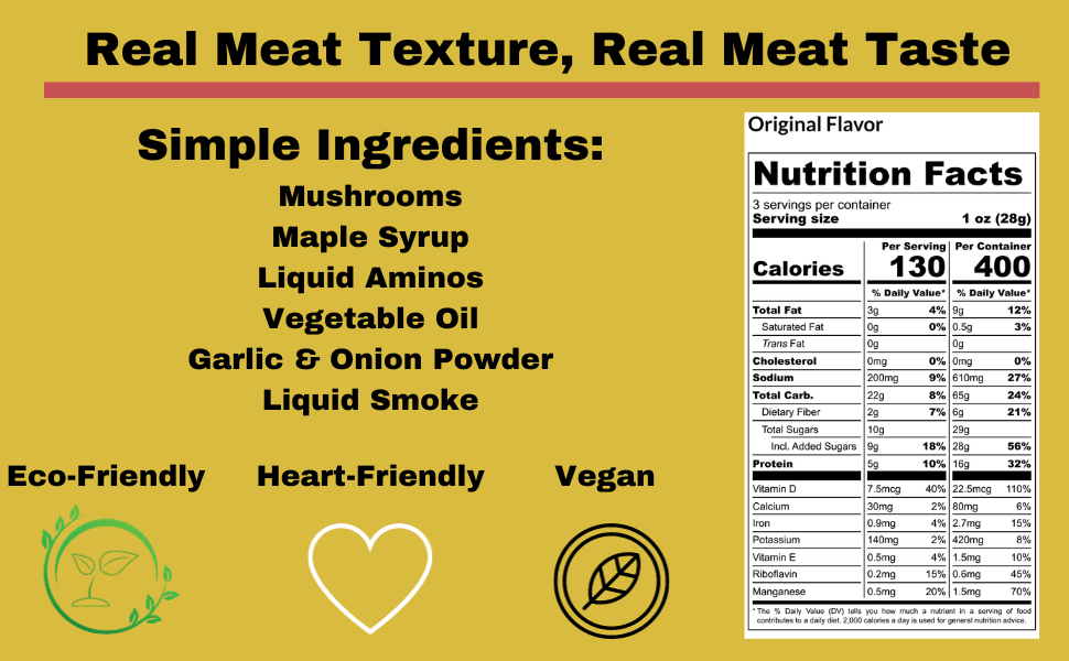 Original Flavor: Revel in the authentic taste and texture reminiscent of the beef jerky you've known, but with a vegan spin. Crafted from oyster mushrooms, this jerky boasts not just a meaty feel but also a delightful balance of sweetness and savory umami. Each piece is a testimony to our dedication to bring the most genuine jerky experience to our plant-based enthusiasts.